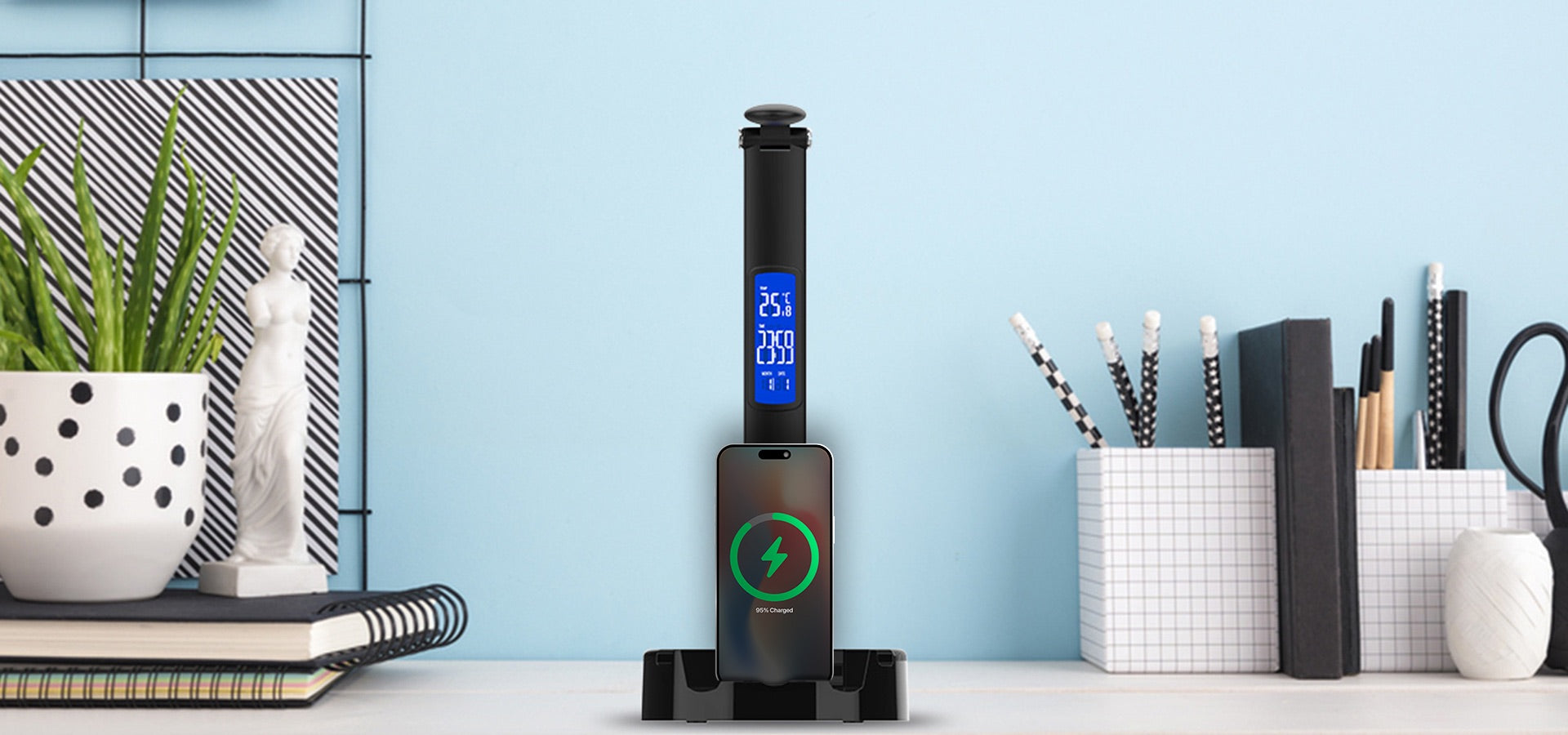 Cup/pen holder, Apple/Samsung watch clip & headset clip, motion sensor night light, built-in USB type C, and a calendar clock display with date, time, and temperature.