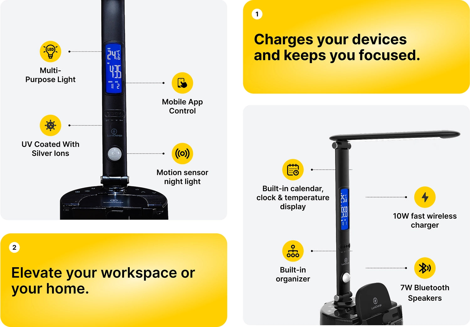 With its sleek and modern design, it not only provides bright, adjustable lighting, but also has a built-in wireless charging pad for your devices. Simply place your phone or another Qi-enabled device on the base of the lamp to charge while you work. No more cluttered cords or searching for charging adapters. The lamp also features a dimmable LED light, so you can adjust the brightness to your desired level. Upgrade your workspace with the convenience and style of the Lumicharge III.